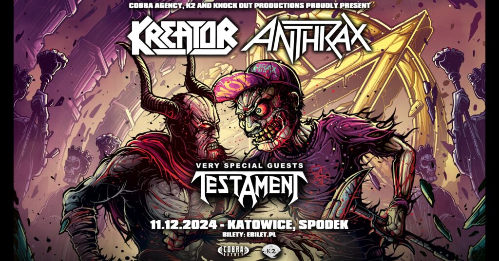 Thrashmetalowe legendy wystąpią 11 grudnia w Katowicach! Kreator zaprezentuje nurt w najbardziej jadowitej i wściekłej odsłonie, a Anthrax w crossoverowej, melodyjnej, często eklektycznej. Wyciągajcie katany z szafy i czyśćcie białe hi-topy – przydadzą się, bo w roli gościa specjalnego dwóch legendarnych formacji zagra jeszcze jedna – amerykański Testament. Krótkie notki o każdej z kapel poniżej: