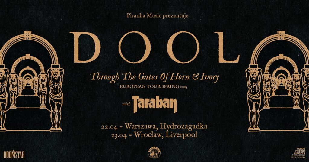 Wraz z Piranha Music zapraszamy na dwa znakomite wieczory z holenderskim zespołem DOOL. Po świetnie przyjętym albumie „The Shape of Fluidity” i koncertach m.in. na Mystic Festival oraz na trasie z Hangman’s Chair (tutaj znajdziecie naszą relację z Krakowa), zespół wróci do naszego kraju na dwa występy: w Warszawie (Hydrozagadka) oraz Wrocławiu (Klub Muzyczny Liverpool). Towarzyszyć im będzie nasz, krajowy Taraban, który promuje swój najnowszy minialbum „Oath”. Kilka słów o obu zespołach poniżej: