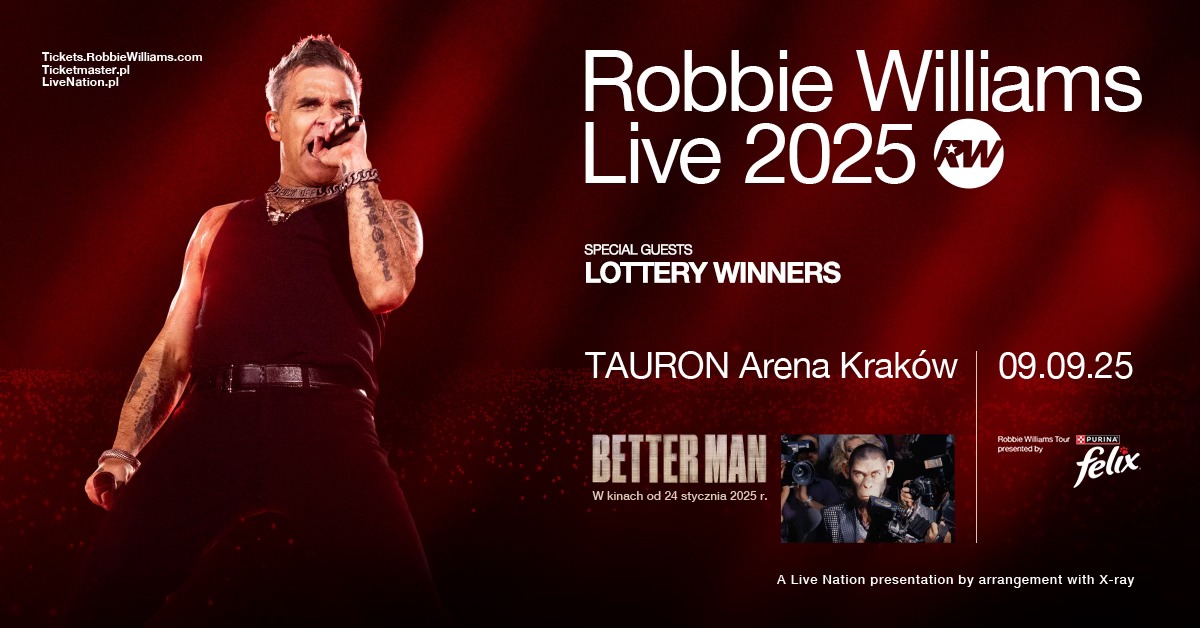 Dokładnie za miesiąc w krakowskiej Tauron Arenie będziemy mieć możliwość ponownego spotkania z brytyjską gwiazdą muzyki pop jaką bez zwątpienia jest Robbie Williams. Rok 2025 należy do niego: na początku roku ukazał się biograficzny film „The Better Man” a od 31 maja artysta jest w trasie a jednym z ostatnich przystanków będzie właśnie Kraków. Do tego jeszcze na 10 października ogłoszona jest data premiery najnowszego albumu Robbiego – „Britpop”. Na tę chwilę poznaliśmy cztery utwory z tej płyty a jeden z nich jest hymnem organizacji FIFA. Supportem na tej trasie jest brytyjski kwartet The Lottery Winners.