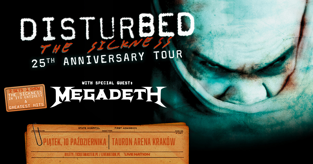 Disturbed ogłosił 17-dniową trasę „The Sickness 25th Anniversary Tour”, która rozpocznie się 28 września w Kopenhadze (Dania) w Royal Arena. Gościem specjalnym na wszystkich koncertach będzie Megadeth. Trasa celebruje 25-lecie przełomowego debiutanckiego krążka “The Sickness”, który ugruntował pozycję zespołu i stał się jednym z najważniejszych i najbardziej wpływowych albumów heavy metalowych wszech czasów. Każdego wieczoru Disturbed wykonają dwie części koncertu. W pierwszej usłyszymy w całości płytę “The Sickness”, a druga część składać się będzie z największych hitów zespołu. W naszym kraju zespół wystąpi w krakowskiej Tauron Arenie.