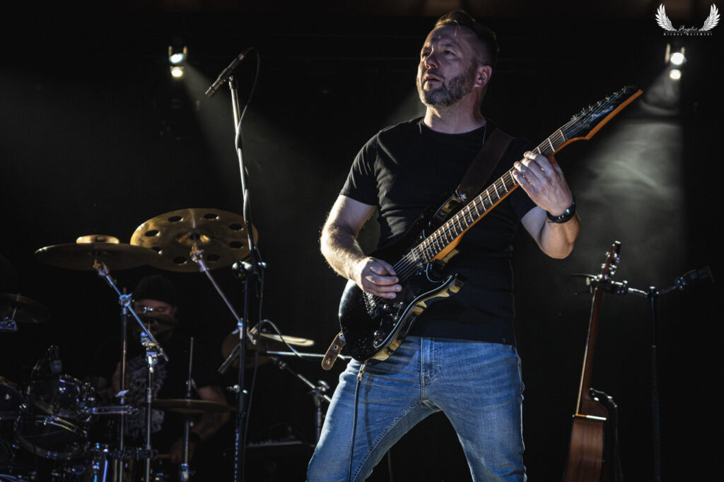 Przejdźmy do kolejnych bohaterów wieczoru. O gitarzyście, Marcinie Kruczku, zwykle piszę w kontekście partii, które wykonuje na recenzowanych przeze mnie płytach (zresztą, wkrótce będzie kolejna ku temu okazja), ponieważ widzieć go na koncertach mam możliwość bardzo rzadko, czego szczerze żałuję (wprawdzie, akurat wtedy widziałem go również następnego dnia, ale o tym niebawem). Marcin jest jednym z moich ulubionych współczesnych gitarzystów w świecie polskiego rocka progresywnego, dlatego ciężko jest mi zachować obiektywizm, bo to jest dokładnie ten rodzaj emocjonalności muzycznej, która najgłębiej do mnie przemawia (np. solo w „Surrender To Win”). Ale Kruczek to nie tylko solówki w stylu Gilmoura czy Latimera, ale też bardziej shredderskie granie, mogące kojarzyć się z rasowymi wymiataczami typu Vai czy Satriani (zwłaszcza w „Flying In Empty Lands” czy „Icarus”). Siedzącym cały czas z tyłu, ale bynajmniej cichym bohaterem tego wieczoru był również perkusista Grzegorz Bauer, nie tylko niezwykle precyzyjny i pomysłowy, ale też zabawny, choć zdaje się, że jego stosunki z panem akustykiem były dość napięte. Na koniec zostawiłem sobie szefa całego przedsięwzięcia, klawiszowca Kamila Konieczniaka, który robi w Moonrise prawie wszystko, a na koncertach przypomina, że jest również zdolnym basistą (na żywo odpowiada także za podkłady basowe generowane z klawisza) i gitarzystą – w „Calling Your Number” i „The Lights Of A Distant Bay” panowie nieco zamienili się rolami i wykonali oba utwory z Kamilem na gitarze elektrycznej, a Marcinem na akustycznej.