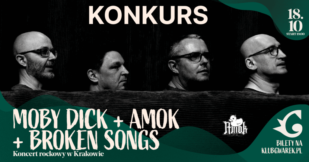 Wraz z Klubem Gwarek mamy dla Was do wygrania dwie podwójne wejściówki na koncert zespołów Moby Dick, Amok oraz Broken Songs, który odbędzie się 18 października w Krakowie.