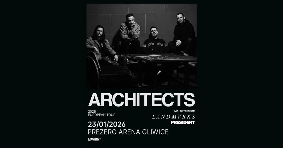 Wraz z Knock Out Productions zapraszamy na koncert Architects! Giganci nowoczesnego, ciężkiego grania wystąpią 23 stycznia 2026 w PreZero Arenie w Gliwicach. Architects są metalcore’owymi gwiazdami z prawdziwego zdarzenia. Końca ich rozwoju i rosnącej sławy właściwie nie widać. Występ w gliwickiej Arenie przypomni, dlaczego tak jest. Oprócz nich wystąpią także Landmvrks i President.