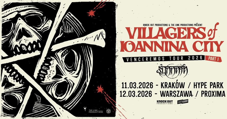 Wraz z KnockOut Productions zapraszamy na dwa polskie koncerty Villagers of Ioannina City wraz z Sunnatą! Zespoły wystąpią 11 marca w krakowskim Hype Parku, a dzień później w warszawskiej Proximie. Ostatnio do składu koncertu w Krakowie dołączył Five The Hierophant, który miał pierwotnie wystąpić w Alchemii.